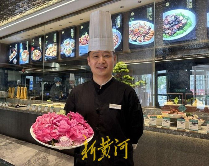 (厨师长魏洪伟手拿洗好的牡丹花瓣)
